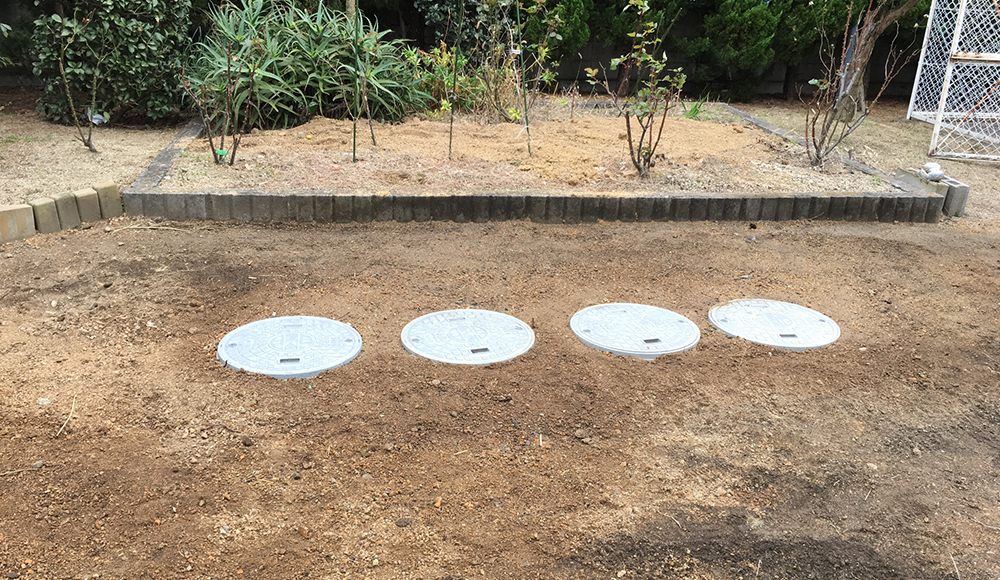 ユンボで穴を掘り、浄化槽を設置した上で、埋戻し作業を行なっております。
