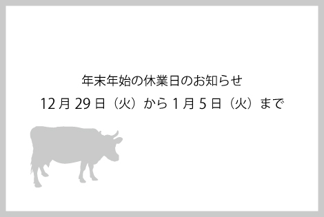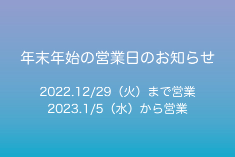 年末年始の営業日についておしらせです。年末の営業は12/28まで、年始は1/7からの営業となっております。